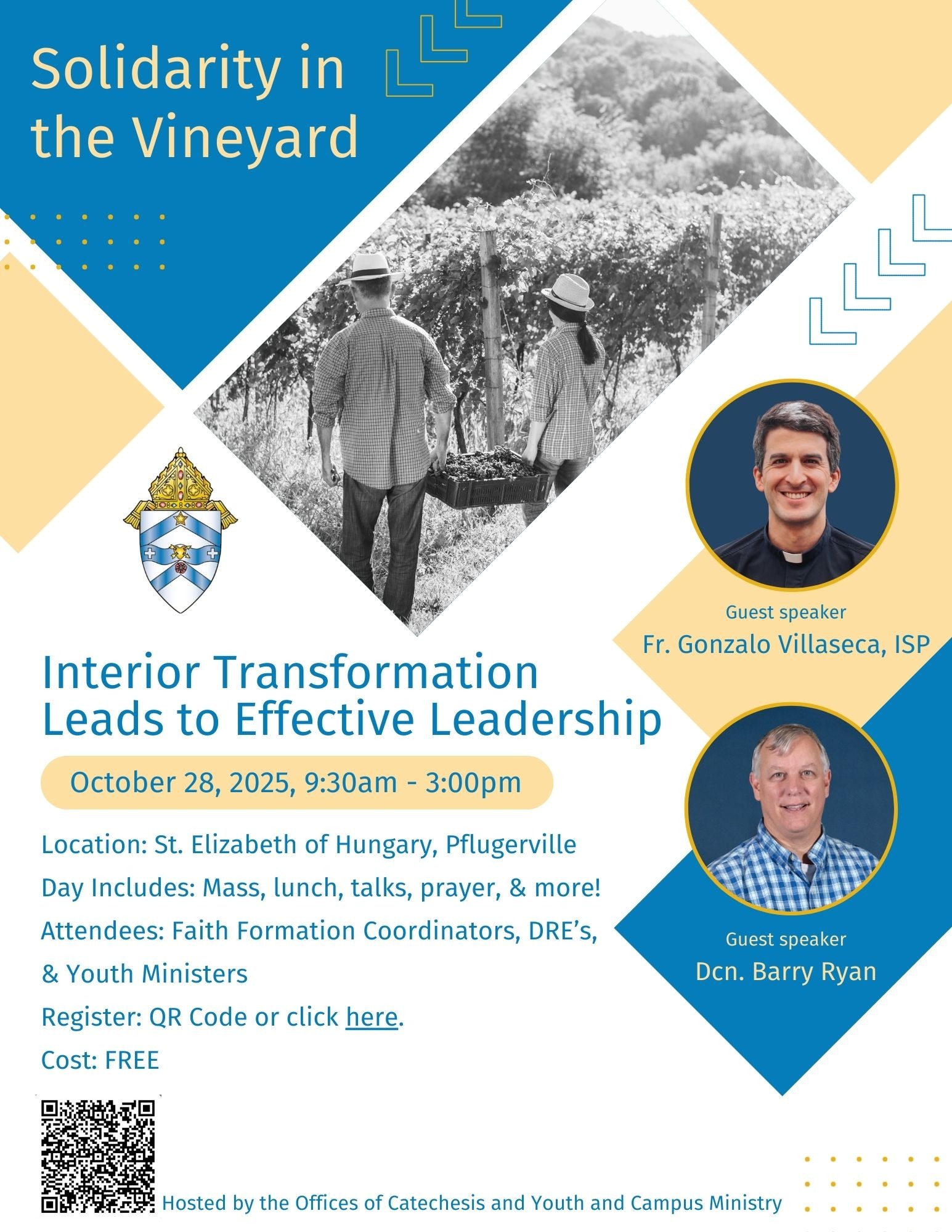 Join parish youth ministers from around the diocese for our semi-annual formation and community gathering. The next gathering will be held on Tuesday, October 28, at St. Elizabeth Parish in Pflugerville.